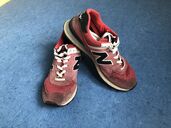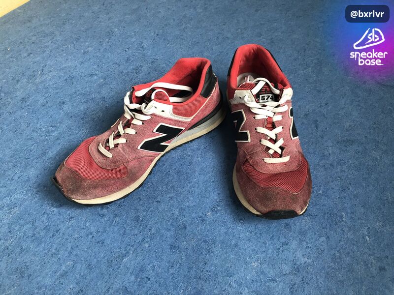 Sind New Balance 574 in Classic Red. Was genau die Modellnummer ist, konnte ich nicht rausfinden. Einfach mal das Bild mit dem Label inspizieren.