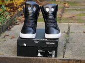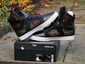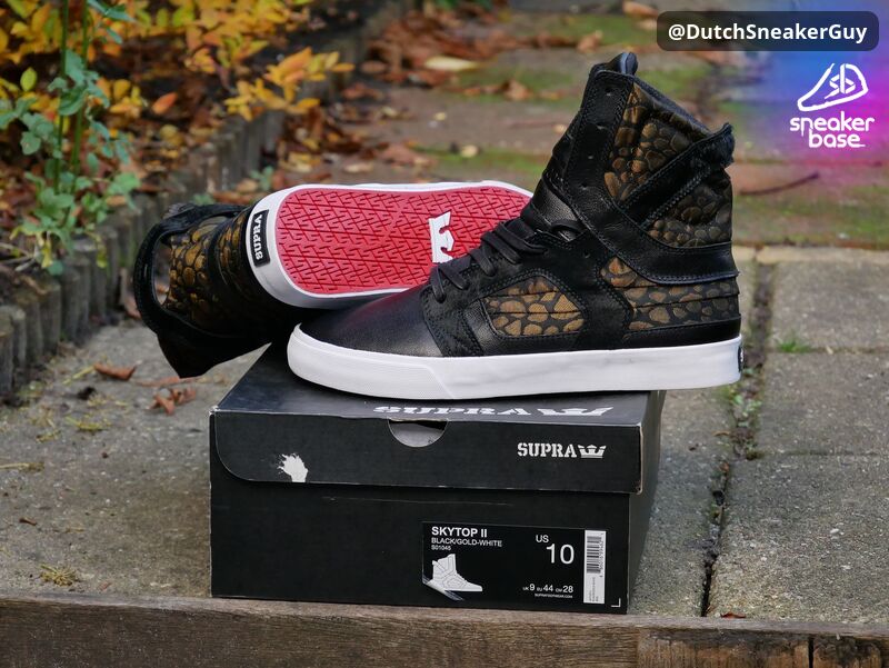 Finally I can add this rare gem to my Supra collection! Absolutely deadstock, never worn, stil in the original box since 2014. Supra Skytop II 'Miner'. Black leather, pony hair, gold pattern fabric, and a red sole. Such a dope combination!