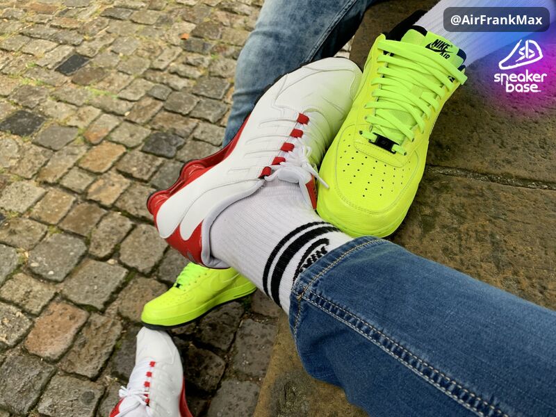 Die neon gelben Air Force One trafen auf weiß rote Shox.