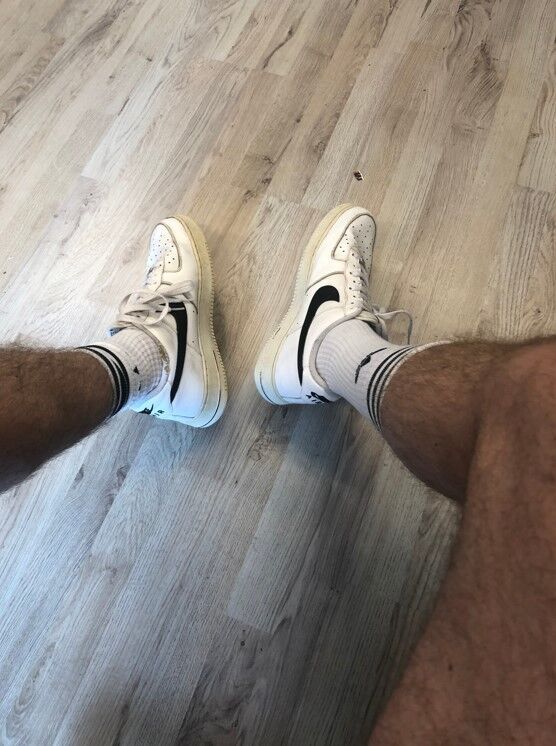 For sale, my well-worn (and fucked on demand) AF1's low with black swoosh... real love sneakers for guys who know what's good in life