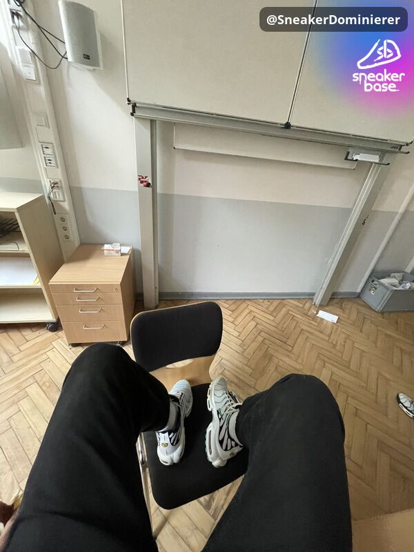 Der Lehrer war zu dem Zeitpunkt etwas holen. Fand es irgendwie cool und dominant mich einfach mal da hinzusetzen und die Sneax drauf zu packen. Mitschüler fanden es lustig.